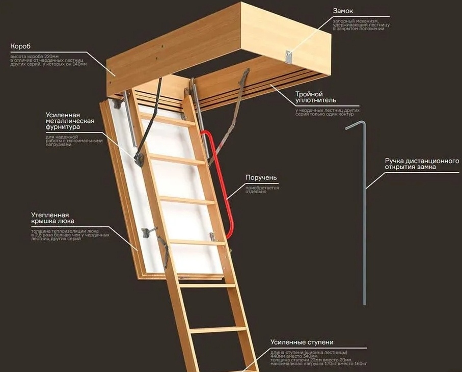 Используйте складную деревянную лестницу с люком, чтобы сделать подъем на чердак безопаснее и сохранить драгоценное пространство в частном доме.