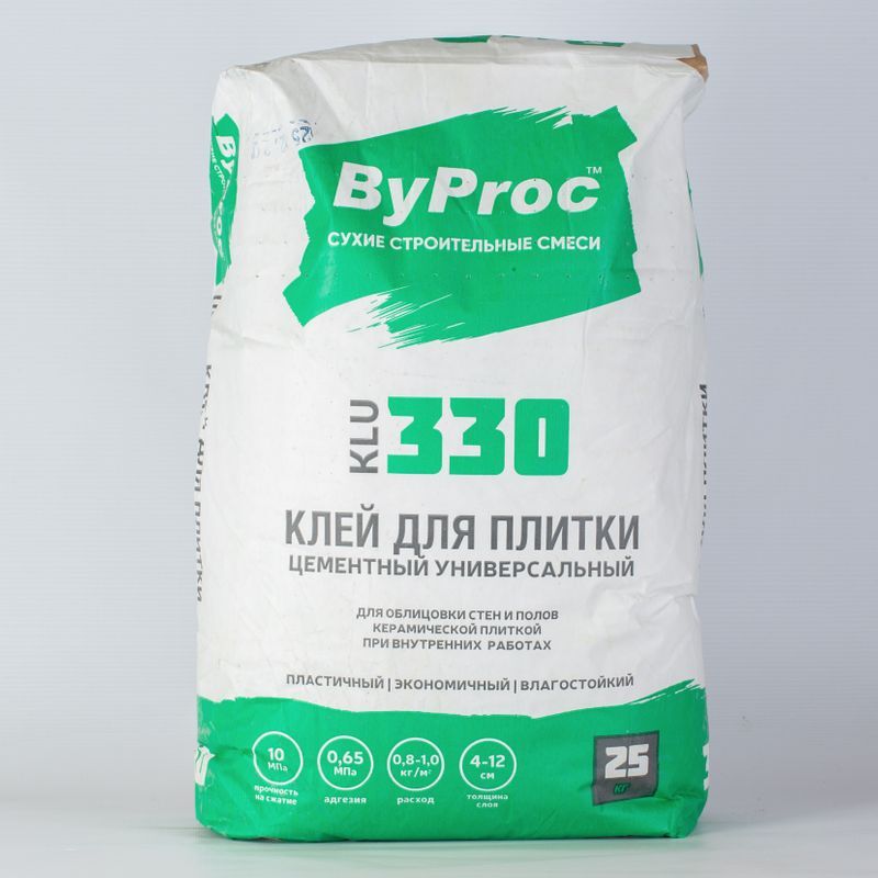 Клей для плитки ByProc KLU-330, 25 кг применяется для фиксации плитки из керамики, камня, керамогранита, мозаики к поверхностям из кирпича, бетона, штукатурки. Пригоден для монтажа на стены, полы, теплые полы.