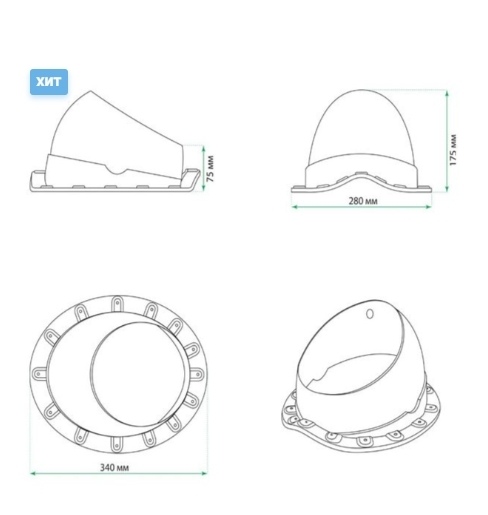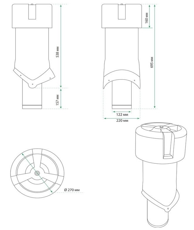 Комплект состоит из выхода вентиляции Krovent Pipe-VT 125is/500, основания Krovent Base-VT Wave 125/150 для вентиляционной трубы и колпака HupCup 270. Продается не комплектом, а по отдельности.