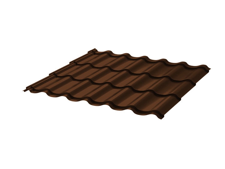 Цена за 1 м2.Металлический лист Монтеррей 0,45 мм ПЭ (цвет – шоколад/коричневый, RAL 8017) копирует вид натуральной керамической черепицы, прочный и устойчивый к нагрузкам.