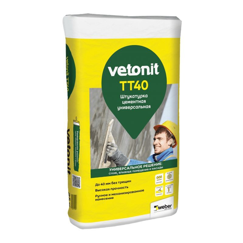 Цементная штукатурка Weber.Vetonit TT40 относится к универсальному составу и предназначена для оштукатуривание фасадов, выравнивания поверхностей при черновой отделке в помещениях с любым уровнем влажности.